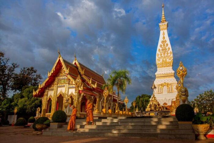 พระธาตุพนม ศาสนสถานอันศักดิ์สิทธิ์แห่งอีสาน ประดิษฐาน ณ วัดพระธาตุพนมวรมหาวิหาร อ.ธาตุพนม จ.นครพนม ถือเป็นพระบรมธาตุที่แสดงถึงความเจริญรุ่งเรืองทางพุทธศาสนาของนครพนมมาแต่โบราณกาล และยังเป็นพระธาตุประจำวันเกิดของผู้ที่เกิดวันอาทิตย์ องค์พระธาตุพนมได้รับการปฏิสังขรณ์หลายครั้งจากความเก่าแก่ขององค์พระธาตุ และภัยพิบัติจากการเกิดฝนตกพายุพัดแรง ประชาชนได้ร่วมบริจาคทุนทรัพย์ และรัฐบาลได้ก่อสร้างองค์พระธาตุขึ้นใหม่สร้างครอบฐานพระธาตุองค์เดิม นอกจากพระบรมสารีริกธาตุที่บรรจุในองค์พระธาตุแล้ว ยังมีของมีค่ามากมายนับหมื่นชิ้น และเชื่อว่าหากใครได้มานมัสการพระธาตุครบ 7 ครั้ง จะถือว่าเป็น “ลูกพระธาตุ” เป็นสิริมงคลแก่ชีวิต หรือแม้แต่การได้มากราบพระธาตุพนม จ ครั้ง ที่ถือเป็น อานิสงส์ผลบุญยิ่งนัก อย่าลืมสัมผัสรสชาติของอาหารพื้นเมืองอย่าง ผัดหมี่โคราชจ.นครราชสีมา, ไก่ย่าง (จ.บุรีรัมย์ จ.ศรีสะเกษ จ.ขอนแก่นจ.ยโสธร), กาแฟดงมะไฟ จ.นครราชสีมา, เนื้อโคขุนโพนยางคำ จ.สกลนคร, ส้มตำ (จ.นครราชสีมา จ.เลย จ.ขอนแก่น จ.หนองบัวลำภู จ.อำนาจเจริญ), เมนูหม่ำ จ.ชัยภูมิ พร้อมของฝากติดไม้ติดมือ ผ้าฝ้ายลายผ้าขาวม้า จ.อำนาจเจริญ, ผ้าไหมมัดหมี่ ลายแคนแก่นคูน จ.ขอนแก่น, ผ้าชัยภูมิ (ไหม, ฝ้าย) จอุบลราชธานี, ข้าวหอมมะลิทุ่งกุลาร้องไห้ จ.ร้อยเอ็ด, ข้าวฮางหนองบัวลำภู จ.หนองบัวลำภู