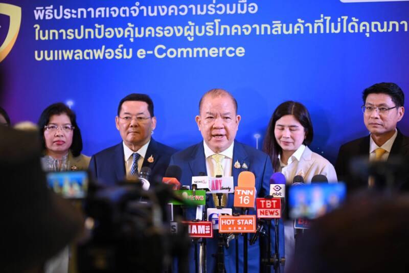 วันที่ 31 มกราคม 2568 นายพิชัย นริพทะพันธุ์ รัฐมนตรีว่าการกระทรวงพาณิชย์ เป็นประธานเปิดงานพิธีประกาศเจตจำนงความร่วมมือในการปกป้องคุ้มครองผู้บริโภคจากสินค้าที่ไม่ได้คุณภาพมาตรฐานบนแพลตฟอร์ม e-Commerce ระหว่างหน่วยงานภาครัฐกับผู้ประกอบธุรกิจบริการแพลตฟอร์ม โดยมีนายนภินทร ศรีสรรพางค์ รัฐมนตรีช่วยว่าการกระทรวงพาณิชย์ ร่วมด้วย ซึ่งจัดโดยกรมการค้าต่างประเทศ กระทรวงพาณิชย์ เพื่อสร้างความร่วมมือในการกำกับดูแลสินค้าที่วางขายบนแพลตฟอร์ม e-Commerce รวมถึงสร้างความตระหนักรู้ให้กับประชาชนเกี่ยวกับความสำคัญและความจำเป็นของการไม่ซื้อขายสินค้าที่ผิดกฎหมาย ซึ่งจะส่งเสริมการทำธุรกรรมซื้อขายสินค้าบนแพลตฟอร์ม e-Commerce ให้มีความน่าเชื่อถือมากยิ่งขึ้น และคุ้มครอง SME ของไทย
