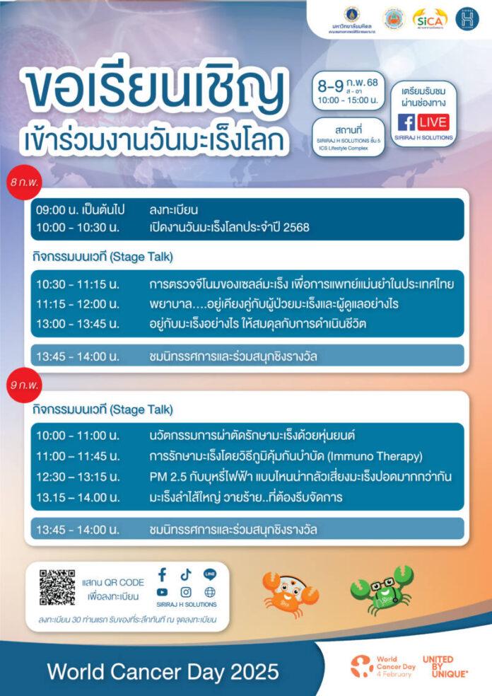 ไอซีเอส ไลฟ์สไตล์ คอมเพล็กซ์ ร่วมกับ คณะแพทยศาสตร์ศิริราชพยาบาล มหาวิทยาลัยมหิดล โดยสถานวิทยามะเร็งศิริราช และ SIRIRAJ H SOLUTIONS ศูนย์สุขภาพเชิงป้องกันและบูรณาการสมดุลชีวิต เตรียมจัดงาน “วันมะเร็งโลก ประจำปี 2568” เปิดโอกาสให้ผู้สนใจรับความรู้เกี่ยวกับโรคมะเร็งผ่านนิทรรศการและกิจรรมเสวนาโดยแพทย์ผู้เชี่ยวชาญในหลากหลายหัวข้อ ฟรี! พร้อมร่วมสนุกชิงรางวัลของที่ระลึกมากมาย ระหว่างวันที่ 8-9 กุมภาพันธ์ 2568 ตั้งแต่เวลา 10.00-15.00 น.ณ SIRIRAJ H SOLUTIONS ชั้น 5 ไอซีเอส ไลฟ์สไตล์ คอมเพล็กซ์ (ตรงข้ามไอคอนสยาม)