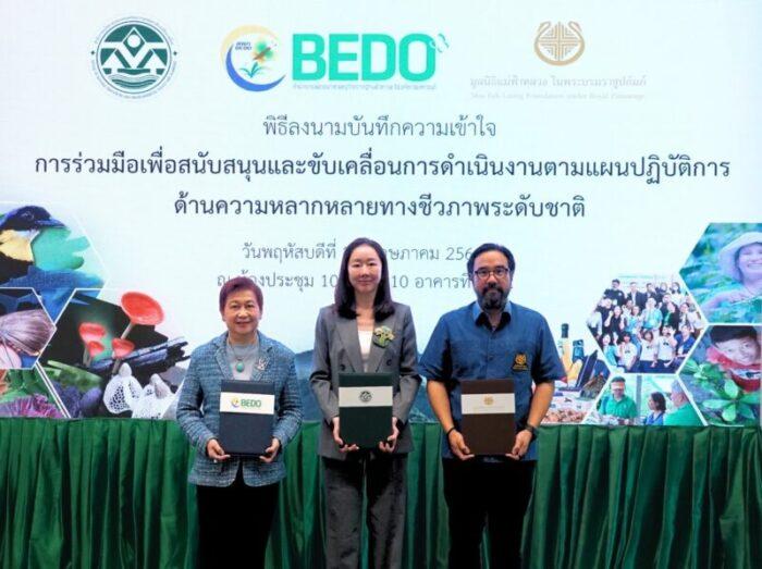 ดร.ชญานันท์ ภักดีจิตต์ เลขาธิการสำนักงานนโยบายและแผนทรัพยากรธรรมชาติและสิ่งแวดล้อม (สผ.)นางสุวรรณา เตียรถ์สุวรรณ ผู้อำนวยการสำนักงานพัฒนาเศรษฐกิจจากฐานชีวภาพ (สพภ.) และหม่อมหลวงดิศปนัดดา ดิศกุล เลขาธิการและประธานเจ้าหน้าที่บริหารมูลนิธิแม่ฟ้าหลวง ในพระบรมราชูปถัมภ์ (มูลนิธิแม่ฟ้าหลวงฯ) ลงนามในบันทึกความเข้าใจ (MOU) ความร่วมมือเพื่อสนับสนุนและขับเคลื่อนการดำเนินงานตามแผนปฏิบัติการด้านความหลากหลายทางชีวภาพระดับชาติ ณ สำนักงานนโยบายและแผนทรัพยากรธรรมชาติและสิ่งแวดล้อม