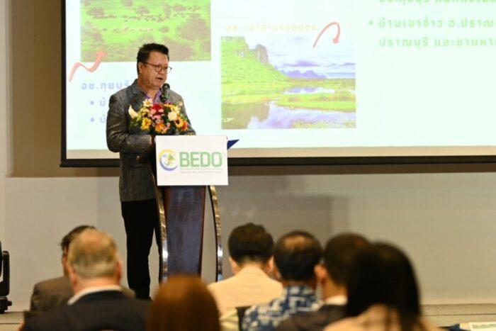 ผู้อำนวยการ BEDO กล่าวต่อว่า BEDO เป็นองค์กรที่มีภารกิจหลักในการพัฒนาเศรษฐกิจจากการใช้ประโยชน์ทรัพยากรความหลากหลายทางชีวภาพอย่างยั่งยืน เพื่อเสริมสร้างเศรษฐกิจในระดับชุมชนที่มีโอกาสในการเข้าถึงและใช้ประโยชน์จากทรัพยากรชีวภาพในระบบนิเวศรอบพื้นที่ชุมชนนั้น การท่องเที่ยวบนพื้นฐานความหลากหลายทางชีวภาพเป็นกิจกรรมการบริการที่ชุมชนสามารถสร้างรายได้เข้าสู่ชุมชน การขับเคลื่อนการท่องเที่ยวยั่งยืนบนพื้นฐานความหลากหลายทางชีวภาพ ที่ BEDO ดำเนินการนี้ เป็นการปรับเครื่องมือหลักในภาคเศรษฐกิจของประเทศไทยคือภาคการท่องเที่ยว ลงมาสู่ระดับย่อยในพื้นที่ คือชุมชนโดยตรง โดยมีองค์ประกอบในธรรมชาติและระบบนิเวศ คือ ความหลากหลายทางชีวภาพเป็นจุดขาย โดยกำหนดพื้นที่นำร่องการดำเนินงานที่จังหวัดประจวบคีรีขันธ์ ในพื้นที่ 3 อำเภอ คือ กุยบุรี สามร้อยยอด และปราณบุรี