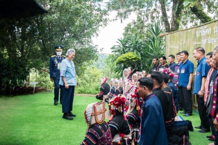 จากนั้น เสด็จฯ ไปทอดพระเนตรศูนย์หัตถกรรมชุมชน ซึ่งมูลนิธิแม่ฟ้าหลวง ฯ รับสนองพระราชดำริพัฒนาคุณภาพชีวิตประชาชนอย่างครบวงจร และเพื่ออนุรักษ์ภูมิปัญญาท้องถิ่นและสร้างอาชีพเสริมให้แก่ราษฎร โดยมูลนิธิแม่ฟ้าหลวงฯ นำธุรกิจเพื่อสังคมแบรนด์ดอยตุงเป็นผู้ฝึกอบรมและออกแบบผลิตภัณฑ์ ฝึกอบรมให้ราษฎรเย็บจักรได้ตามมาตรฐานพร้อมกับจ้างงานกลุ่มสตรีในชุมชน