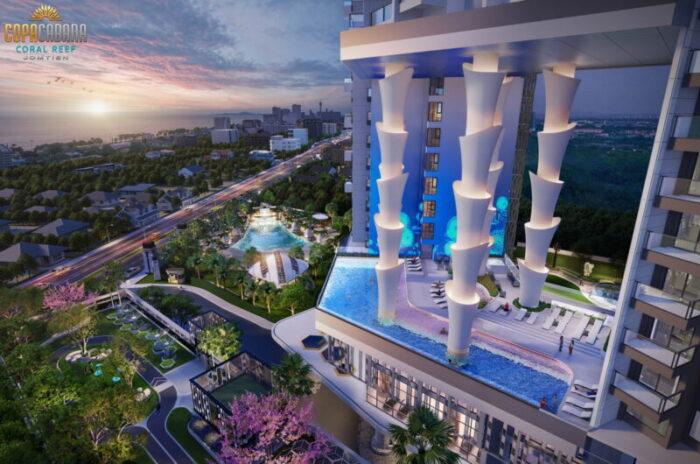 ด้วยความมุ่งมั่น ความซื่อสัตย์ และความจริงใจ เพื่อมอบประสบการณ์การอยู่อาศัยที่มีคุณภาพสูงสุดให้กับลูกค้าโคปาคาบาน่า กรุ๊ป ต่อยอดความสำเร็จเปิดโครงการแห่งที่สองในทำเลใกล้ๆ กับโครงการแรก ตอกย้ำอาณาจักรแบรนด์ โคปาคาบาน่า กรุ๊ป ในชื่อโครงการ โคปาคาบาน่า คอรัล รีฟ จอมเทียน (Copacabana Coral Reef Jomtien) เป็นคอนโดฯ High Rise Residential สไตล์โมเดิร์นตอบโจทย์ทุก Generation ในราคาเริ่มต้น 3.6 ล้านบาท* เฉลี่ยตารางเมตรที่ 90,000 บาท มาในคอนเซ็ปต์ “อัญมณีแห่งท้องทะเล (The Jewels of The Sea)” เพียบพร้อมด้วยสิ่งอำนวยความสะดวกที่ครบครัน และทันสมัย ส่วนกลางสุดอลังการ และการบริการระดับโรงแรม 5 ดาว บนเนื้อที่กว่า 13 ไร่ครึ่ง ทำเลที่ตั้งสุดพิเศษ! ใกล้หาดจอมเทียนเพียงแค่ 4 นาทีเป็นอาคารสูง 55 ชั้น มีห้องชุดพักอาศัยจำนวน 1,897 ยูนิต จอดรถ 5 ชั้น และอาคารจอดรถเสริม 2 ชั้น มูลค่าโครงการกว่า 11,000 ล้านบาท เปิดตัวเมื่อเดือนตุลาคม 2567 เปิดขายเพียง 8 เดือน มียอดขายกว่า 700 ยูนิต ลูกค้าต่างชาติเริ่มกลับมามากขึ้นเห็นได้จากยอดขาย 2 ใน 3 ของยูนิตที่ขายได้เป็นชาวไทย 15% ชาวต่างชาติ 25% เป็นลูกค้าจากยุโรป รัสเซีย อเมริกา และแคนาดา เป็นต้น ส่วนที่เหลือเจาะตลาดลูกค้าคนไทย คาดว่าจะขายได้หมดก่อนที่จะก่อสร้างเสร็จ