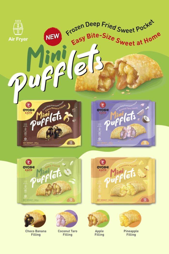 - โอโยชิ อีทโตะ “มินิ พัฟเฟลตส์” (OYOSHI EATO Mini Pufflets) ขนมแป้งทอดกรอบไส้หวาน ขนาดพอดีคำ มาพร้อม 4 รสชาติ ได้แก่ ช็อกโกบานาน่า แอปเปิ้ล สับปะรด และเผือกมะพร้าว ออกแบบมาเพื่อเจาะกลุ่ม “Premium Snacking” ที่กำลังเติบโตอย่างรวดเร็วในตลาดยุโรป โดยเน้นความสะดวก อร่อย และคุณภาพสูงในทุกมื้อว่าง