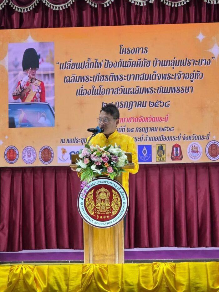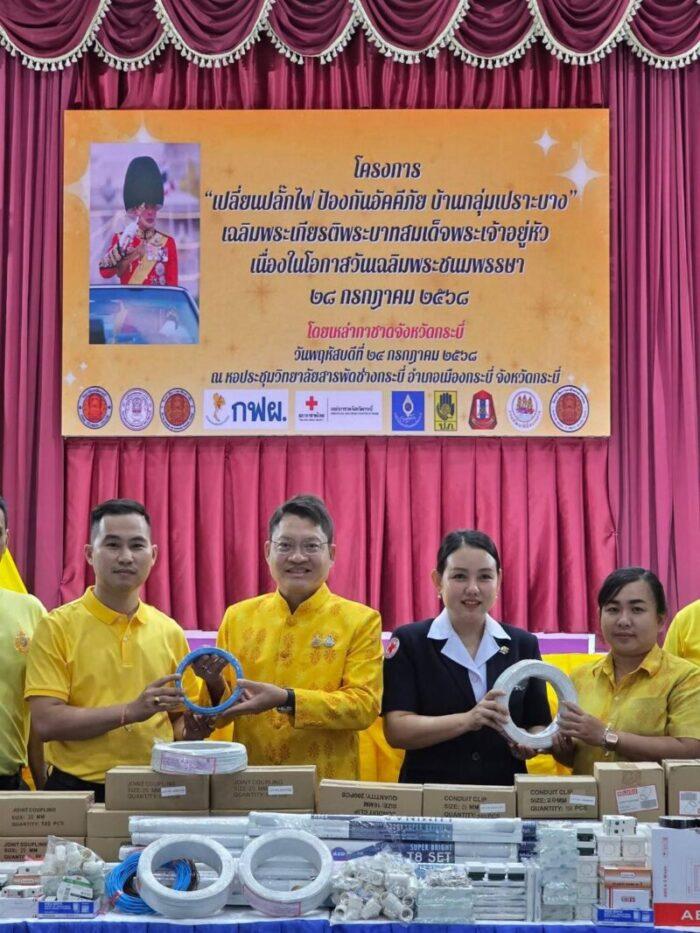 นางศรินทิพย์ ศีลาเทวากูล นายกเหล่ากาชาดจังหวัดกระบี่ จัดโครงการเปลี่ยนปลั๊กไฟ ป้องกันอัคคีภัย บ้านกลุ่มเปราะบาง เฉลิมพระเกียรติพระบาทสมเด็จพระเจ้าอยู่หัว เนื่องในโอกาสวันเฉลิมพระชนมพรรษา 28 กรกฎาคม 2568 โดยมี นายอังกูร ศีลาเทวากูล ผู้ว่าราชการจังหวัดกระบี่ เป็นประธานในงาน ณ วิทยาลัยสารพัดช่างกระบี่
