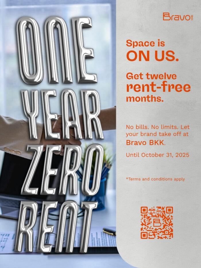 เพื่อตอกย้ำถึงแผนครึ่งปีหลังที่ต้องการสร้างพันธมิตรใหม่ ๆ แคมเปญ “One Year Zero Rent” จึงเป็นการมอบข้อเสนอสุดพิเศษให้แบรนด์และผู้ประกอบการที่มองหาพื้นที่ในการเริ่มต้นธุรกิจหรือขยายธุรกิจเช่าพื้นที่ฟรีนาน 12 เดือน เมื่อเซ็นต์สัญญาเช่าพื้นที่กับ Bravo BKK ตามเงื่อนไขที่กำหนด (สัญญาเช่า 3 ปี: ปีที่ 1 ฟรีค่าเช่า 100% ปีที่ 2 รับส่วนลดค่าเช่า 50% และปีที่ 3 ชำระค่าเช่าในอัตราปกติ) ตั้งแต่วันที่ 1 สิงหาคม 2568 – 31 ตุลาคม 2568 โดยผู้ประกอบการที่สนใจสามารถส่งโปรไฟล์ธุรกิจ ร้านค้า เพื่อพิจารณาเข้าร่วมแคมเปญได้ที่ อีเมล : leasingandevent-team@bravobkk.co.th หรือ Line Official @Bravo BKK