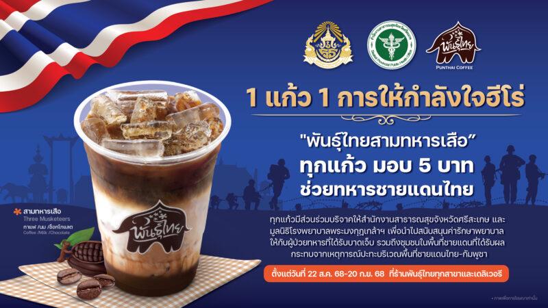 กาแฟพันธุ์ไทยร่วมสนับสนุนทหารแนวรบชายแดนผู้เสียสละ กับโครงการ “1 แก้ว 1 การให้กำลังใจฮีโร่” โดยทุกการสั่งซื้อเมนู ‘สามทหารเสือ’ 1 แก้ว ลูกค้าจะมีส่วนร่วมในการบริจาคเงิน 5 บาท ให้แก่สำนักงานสาธารณสุขจังหวัดศรีสะเกษ และ โรงพยาบาลพระมงกุฎเกล้าในพระราชูปถัมภ์ สมเด็จพระเทพรัตนราชสุดาฯ สยามบรมราชกุมารี เพื่อนำไปสนับสนุนค่ารักษาพยาบาล จัดหาอุปกรณ์ทางการแพทย์ เวชภัณฑ์ และเครื่องมือแพทย์ที่จำเป็นและทันสมัย พร้อมเพิ่มประสิทธิภาพการรักษาให้กับผู้ป่วยทหารที่ได้รับบาดเจ็บจากการปฏิบัติหน้าที่ในเหตุปะทะบริเวณพื้นที่ชายแดนไทย – กัมพูชา ตั้งแต่วันที่ 22 สิงหาคม 2568 – 20 กันยายน 2568 ที่ร้านกาแฟพันธุ์ไทยทุกสาขาที่ร่วมรายการ และ บริการเดลิเวอรีจัดส่งถึงบ้าน