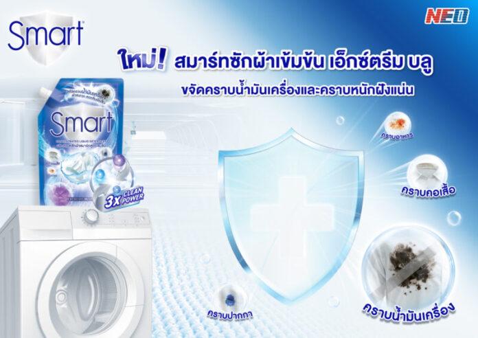 สมาร์ท (Smart) ผลิตภัณฑ์ซักผ้ามาตรฐานสากล แบรนด์แรกในไทยที่พัฒนาผลิตภัณฑ์ซักผ้าสูตรเข้มข้น ที่มีคุณสมบัติขจัดคราบน้ำมันเครื่อง ภายใต้บริษัท นีโอ คอร์ปอเรท จำกัด (มหาชน) ส่งผลิตภัณฑ์ซักผ้าชนิดน้ำเข้มข้นสูตรใหม่! “สมาร์ท ซักผ้าสูตรเข้มข้น เอ็กซ์ตรีม บลู” (Smart Concentrated Liquid Detergent Extreme Blue) แบรนด์แรกและแบรนด์เดียวในไทยที่กล้าการันตีสามารถขจัดคราบน้ำมันเครื่องได้อย่างมีประสิทธิภาพ ขจัดกลิ่นอับ พร้อมกลิ่นหอมสะอาดสดชื่น สำหรับทุกเพศทุกวัย เพิ่มความมั่นใจทุกครั้งที่สวมใส่