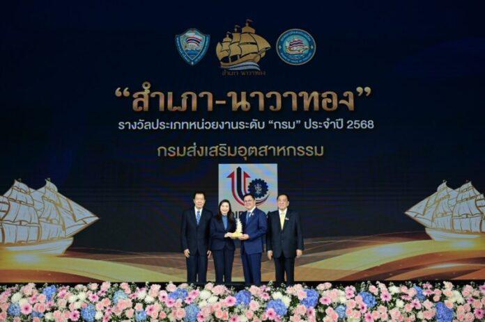 ดร.ณัฐพล รังสิตพล ปลัดกระทรวงอุตสาหกรรม พร้อมด้วย นางสาวณัฏฐิญา เนตยสุภา อธิบดีกรมส่งเสริมอุตสาหกรรม ให้เกียรติเข้าร่วมรับรางวัล “สำเภา-นาวาทอง ประจำปี 2568” ในระดับกระทรวงและกรมตามลำดับ โดยมี นายจตุพร บุรุษพัฒน์ รัฐมนตรีว่าการกระทรวงพาณิชย์ ให้เกียรติเป็นผู้มอบรางวัลและกล่าวแสดงความยินดี พร้อมทั้งกล่าวปาฐกถาพิเศษ เรื่อง “ประสิทธิภาพหน่วยงานภาครัฐ กับการพัฒนาประเทศที่ยั่งยืน” ร่วมด้วย นายดุสิต อนันตรักษ์ รองอธิบดีกรมส่งเสริมอุตสาหกรรม นายวุฒิชัย ประชาพร ผู้อำนวยการศูนย์เทคโนโลยีสารสนเทศและการสื่อสาร นายวีระพล ผ่องสุภา เลขานุการกรม และข้าราชการกรมส่งเสริมอุตสาหกรรม หรือดีพร้อม (DIPROM) นอกจากนี้ ยังมีหัวหน้าส่วนราชการทั้งระดับกระทรวง กรม ภูมิภาค ผู้แทนหน่วยงานภาครัฐวิสาหกิจและเอกชน และสื่อมวลชนจำนวนมาก เข้าร่วมพิธีมอบรางวัลดังกล่าว ณ หอประชุมใหญ่ มหาวิทยาลัยหอการค้าไทย อาคาร 15 ถ.วิภาวดีรังสิต ดินแดง
