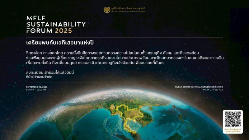 ท่ามกลางความไม่แน่นอนทั้งเศรษฐกิจ สังคม และสิ่งแวดล้อม ความยั่งยืนคือทางรอด มูลนิธิแม่ฟ้าหลวง ในพระบรมราชูปถัมภ์ จัดงาน MFLF Sustainability Forum 2025 เวทีถกประเด็นร้อนด้านเศรษฐกิจ สังคม และสิ่งแวดล้อม ภายใต้ธีม “วิกฤตโลก ทางออกไทย” วันจันทร์ที่ 22 กันยายน 2568 เวลา 08.30 – 12.00 น. ณ ห้องประชุมใหญ่ ชั้น 2 ศูนย์การประชุมแห่งชาติสิริกิติ์