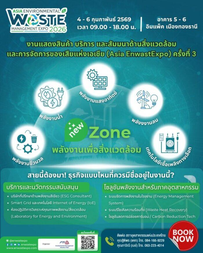 Asia Environmental and Waste Management Expo 2026 ” (Asia EnwastExpo 2026) ภายใต้แนวคิด “Empowering Asia’s Green Future– ขับเคลื่อนเอเชีย สู่เศรษฐกิจสีเขียว” ระหว่างวันที่ 4 – 6 กุมภาพันธ์ 2569 ณ อาคาร 5 – 6 ศูนย์แสดงสินค้าอิมแพ็ค เมืองทองธานี เปิดให้เข้าชมตั้งแต่เวลา 09.00-18.00 น.