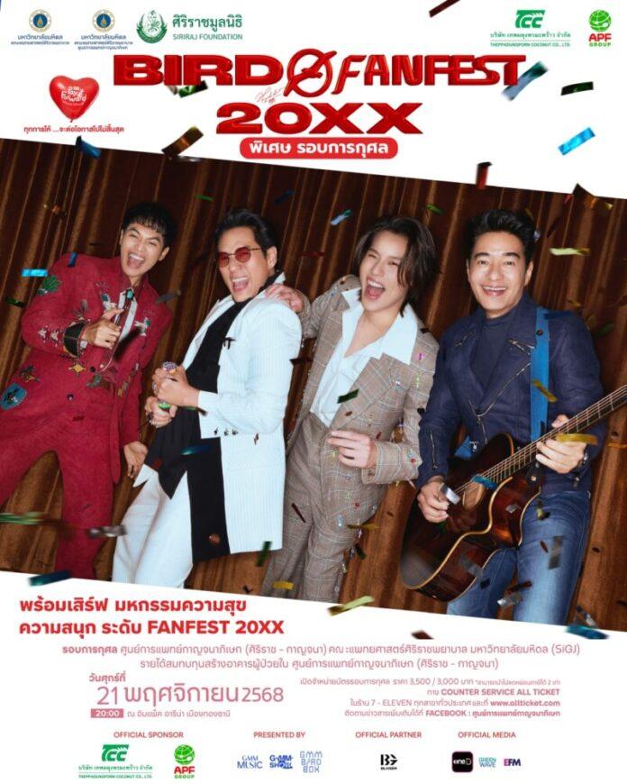 เบิร์ด ธงไชย แมคอินไตย์ ซูเปอร์สตาร์ขวัญใจคนไทยทุกยุค เตรียมคืนเวทีครั้งสำคัญใน “BIRD FANFEST 20XX” มหกรรมความสนุกระดับ FANFEST ในรอบการแสดงวันศุกร์ที่ 21 พฤศจิกายน 2568 เวลา 20.00 น. ณ อิมแพ็ค อารีน่า เมืองทองธานี ซึ่งเป็นรอบพิเศษเพื่อการกุศล โดยรายได้จากการจำหน่ายบัตร รอบดังกล่าวจะนำไปสมทบทุนสร้างอาคารหอผู้ป่วยในแห่งใหม่ของศูนย์การแพทย์กาญจนาภิเษก คณะแพทยศาสตร์ศิริราชพยาบาล มหาวิทยาลัยมหิดล