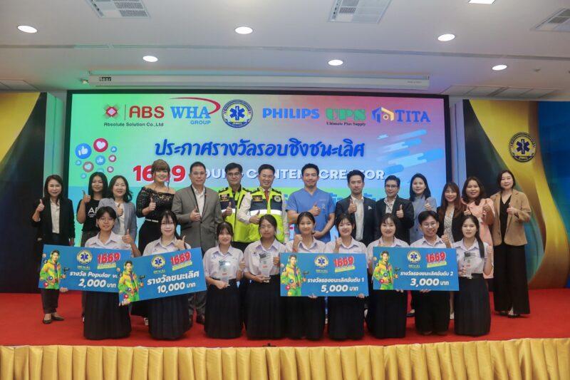 ​ในการนี้ คุณธนภรณ์ อัศวลิขิตสม ผู้จัดการฝ่ายการตลาดและพัฒนาธุรกิจ บริษัท อัลติเมท พลัส ซัพพลาย จำกัด ร่วมกับบริษัทฟิลิปส์ (ประเทศไทย) จำกัด เป็นผู้แทนบริษัทฯ สนับสนุนเครื่องกระตุกหัวใจไฟฟ้า (AED) ยี่ห้อ Philips พร้อมตู้ มูลค่ากว่า 70,000 บาท นำไปติดตั้งที่โรงเรียนของน้องๆ เยาวชนที่ได้รับรางวัลชนะเลิศ พร้อมอบรมให้ความรู้การปฐมพยาบาลขั้นพื้นฐานด้วยการ CPR และการใช้เครื่อง AED ให้กับคุณครูและนักเรียน และยังสนับสนุนเงินรางวัลให้กับทีมที่ได้รางวัลรองชนะเลิศอันดับ 1 อันดับ 2 และ Popular Vote นอกจากนี้ คุณอำนาจ ศรีจำเริญ กรรมการผู้จัดการ บริษัท แอ็บโซลูท โซลูชั่น จำกัด ยังได้เป็นตัวแทนมอบเงินรางวัลจำนวน 10,000 บาท และคุณอภิญญา คูหาเรืองรอง ผู้อำนวยการฝ่ายการตลาดองค์กร บริษัท ดับบลิวเอชเอ คอร์ปอเรชั่น จำกัด (มหาชน) ร่วมสนับสนุนกระเป๋านักเรียนที่ผลิตจากวัสดุเหลือใช้ เช่น ขวดพลาสติก PET ที่นำมาอัพไซเคิลใช้เทคโนลยีผลิตเป็นเส้นใยจากขวดพลาสติกมาผสมกับเส้นใยผักตบชวา ที่ได้จากการบำบัดน้ำเสียในนิคมอุตสาหกรรมของ WHA Group ให้แก่น้องๆ เยาวชนทั้ง 10 ทีมที่ผ่านเข้ารอบ นอกจากนี้ กิจกรรมในวันประกาศผล น้องๆ เยาวชนทั้ง 10 ทีมยังได้โอกาสเข้าศึกษาดูงานระบบการแพทย์ฉุกเฉินในพื้นที่สถาบันการแพทย์ฉุกเฉินแห่งชาติ อันได้แก่ ศูนย์นเรนทร รถสื่อสารสั่งการเคลื่อนที่และดาวเทียม ห้องฝึกปฏิบัติการเสมือนจริง EMS Simulation Smart Helicopter และ Immersive Training และศูนย์สื่อการแพทย์ฉุกเฉิน EMS Media Center รวมถึงยังได้แรงบันดาลใจดีๆ จากแขกรับเชิญพิเศษ “คุณเป๊ป” เขมิกา สุขประสงค์ดี นักแสดงและอินฟลูเอนเซอร์ชื่อดังอีกด้วย