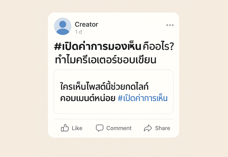 ในช่วงที่ผ่านมา ผู้ใช้เฟซบุ๊กจำนวนไม่น้อยคงสะดุดตากับโพสต์ที่มีข้อความแนบว่า “ใครเห็นโพสต์นี้ช่วยกดไลก์คอมเมนต์หน่อย #เปิดค่าการมองเห็น” จนกลายเป็นปรากฏการณ์แพร่หลาย โดยเฉพาะในหมู่ครีเอเตอร์และเพจขนาดเล็กที่พยายามหาทางเอาตัวรอดจากการเข้าถึง (Reach) ที่ลดลงอย่างต่อเนื่อง