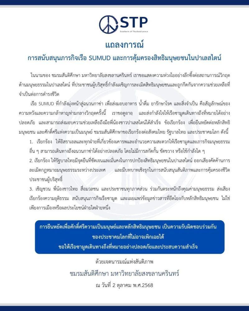 ชมรมสันติศึกษา มหาวิทยาลัยสงขลานครินทร์ ออกแถลงการณ์เมื่อวันพุธ (2 ต.ค. 68) แสดงความห่วงใยอย่างลึกซึ้งต่อวิกฤตด้านมนุษยธรรมในปาเลสไตน์ พร้อมประกาศสนับสนุนภารกิจเรือ “ซุมูด” (SUMUD) ที่กำลังมุ่งหน้าไปยังฉนวนกาซ่าเพื่อนำอาหาร น้ำดื่ม ยารักษาโรค และสิ่งจำเป็นไปช่วยเหลือประชาชนที่กำลังเดือดร้อน