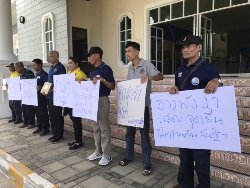 ผู้ชุมนุมถือป้ายข้อความทั้งภาษาไทยและอังกฤษ แสดงจุดยืนว่า “ชาวพังงาคัดค้านฐานทัพสหรัฐฯ” พร้อมเรียกร้องให้รัฐบาลออกมาชี้แจงข้อเท็จจริงเกี่ยวกับข่าวดังกล่าว
