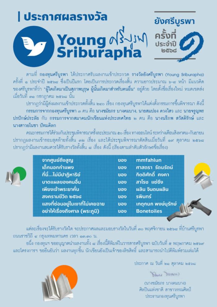 กองทุนศรีบูรพาประกาศผล 8 เรื่องสั้น เข้ารอบสุดท้าย รางวัลยังศรีบูรพา (Young Sriburapha) ครั้งที่ 1 และกำหนดประกาศผลและมอบรางวัล 30 พ.ย. 68 ที่บ้านศรีบูรพา