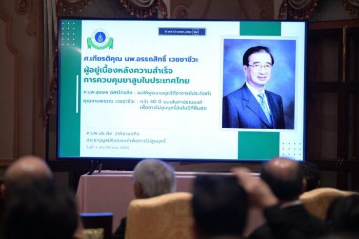 ราชบัณฑิตยสภาสดุดีคุณูปการ “ศ.นพ.อรรถสิทธิ์ เวชชาชีวะ” ผู้วางรากฐานสังคมไทยปลอดบุหรี่ ด้าน “หมอประกิต” จี้รัฐบาลปราบปรามบุหรี่ไฟฟ้าอย่างจริงจัง หลังพบสถิติเยาวชนเสพติดบุหรี่ไฟฟ้าพุ่งกระฉูด วอนรัฐบาลให้ความสำคัญบังคับใช้กฎหมายควบคุมยาสูบอย่างเด็ดขาด