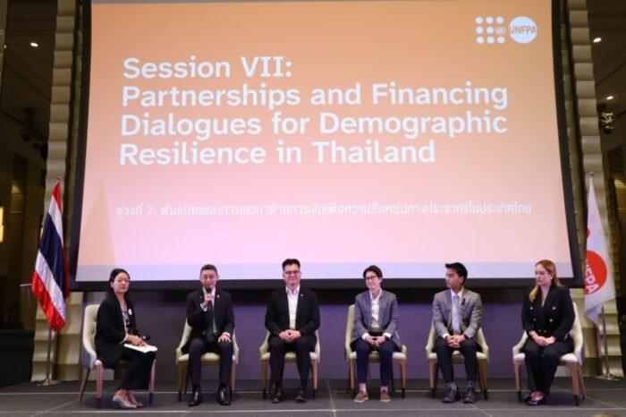 ท้ายที่สุด เพื่อการแลกเปลี่ยนความคิดเห็นจากทุกภาคส่วนของสังคม การเสวนาเชิงวิสัยทัศน์หัวข้อ “ความร่วมมือและการระดมทุนเพื่อการเสริมสร้างความยืดหยุ่นทางประชากรในประเทศไทย” ได้เปิดพื้นที่ให้ผู้คนเข้าร่วมแลกเปลี่ยนอย่างกว้างขวาง ทั้งผู้บริจาค ผู้บริหารภาคเอกชน สื่อมวลชน ภาควิชาการ และองค์กรภาคประชาสังคม การพูดคุยนั้นมุ่งเน้นไปที่ความจำเป็นเร่งด่วนในการระดมรูปแบบการจัดหาเงินทุนที่สร้างสรรค์และยั่งยืน เพื่อสนับสนุนนโยบายการเปลี่ยนแปลงโครงสร้างประชากร สุขภาพทางเพศและอนามัยการเจริญพันธุ์และระบบการดูแล รวมถึงโครงการความเสมอภาคทางเพศต่างๆ โดยเวทีนี้ปิดท้ายด้วย การเรียกร้องให้ลงมือปฏิบัติ ที่กระตุ้นให้เกิดความร่วมมือข้ามภาคส่วนที่เข้มแข็งยิ่งขึ้น และการลงทุนที่ตรงเป้าหมายในแนวทางการพัฒนาที่มีประชาชนเป็นศูนย์กลาง โดยเฉพาะ ผู้หญิง เยาวชน และประชากรกลุ่มเปราะบาง