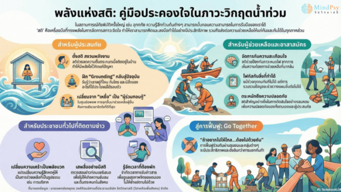 สสส. สานพลัง สวร. หนุนรัฐบาลฟื้นฟูสุขภาพใจประชาชน 10 จังหวัดภาคใต้ จากสถานการณ์น้ำท่วม เดินหน้าชวนใช้ “สติ 3 ขั้นตอน” รับมือวิกฤตภัยพิบัติ-ลดหวั่นวิตกว้าวุ่นใจ-จัดการปัญหาอย่างมีประสิทธิภาพ แนะระยะฟื้นฟู ต้องยึดหลัก “ไปด้วยกัน(Together Base)” เปลี่ยนเหยื่อเป็นผู้ร่วมกอบกู้วิกฤต สร้างพลังชุมชนเข้มแข็ง ร่วมเยียวยาใจ ลดปัญหาสุขภาพจิตระยะยาว