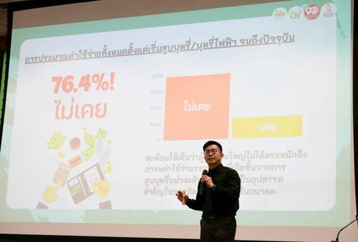ดร.นพ.ไพโรจน์ เสาน่วม รองผู้จัดการกองทุน สสส. กล่าวว่า ปัจจุบันโครงสร้างตลาดยาสูบเปลี่ยนแปลงไปอย่างรวดเร็วจากการเข้ามาของบุหรี่ไฟฟ้า สสส. ได้สนับสนุนทีมวิจัยคณะเศรษฐศาสตร์ มหาวิทยาลัยธรรมศาสตร์ ศึกษาวิจัยสถานการณ์ค่าใช้จ่ายในการสูบบุหรี่/บุหรี่ไฟฟ้า และพฤติกรรมการสูบ ในพื้นที่ 19 จังหวัด ผลการศึกษาแสดงให้เห็นถึงความท้าทายใหม่ๆ ที่พบว่า บุหรี่ไฟฟ้าเจาะกลุ่มเป้าหมายใหม่ คือกลุ่มเยาวชน 15-20 ปี เป็นผู้สูบถึง 48.95% และผู้หญิง 52.9% สาเหตุหลักที่ทำให้เข้าสู่วงจรการสูบไม่ใช่การติดนิโคติน แต่เป็น “รสชาติและกลิ่น” รวมถึงการมีภาพลักษณ์อุปกรณ์ที่ทันสมัย ขณะที่การซื้อผ่านช่องทางออนไลน์ โดยเฉพาะ LINE และ Facebook เป็นช่องทางหลักที่เยาวชนเข้าถึงบุหรี่ไฟฟ้าได้ง่ายที่สุด นอกจากนี้ ยังมีเรื่องอคติทางพฤติกรรม (Behavioral Bias) ที่ทำให้ผู้สูบไม่ตระหนักถึงภาระทางการเงินและสุขภาพในระยะยาว โดยผู้สูบบุหรี่ไฟฟ้าประเมินอันตรายต่อตนเองต่ำที่สุด ส่วนการสูบบุหรี่มวนยังคงเป็นการสูบที่พบมากที่สุดถึง 66.8% ในจำนวนนี้ สูบเป็นประจำทุกวัน 73% ส่วนใหญ่ซื้อจากร้านขายของชำและร้านสะดวกซื้อ อย่างไรก็ตาม ผู้สูบตระหนักว่าการเลิกสูบจะช่วยประหยัดเงินได้ รวมถึงมองว่าอันตรายจากบุหรี่มวนทั้งต่อตนเองและผู้อื่นสูงกว่าบุหรี่ไฟฟ้า