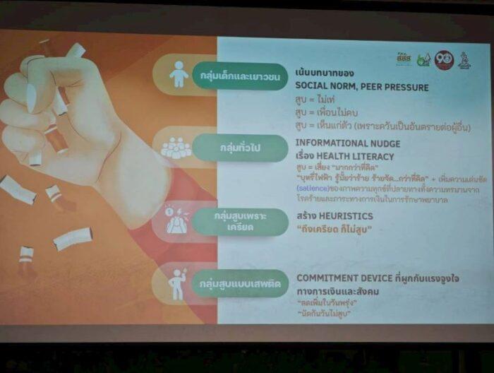 ผศ.ดร.วศิน กล่าวต่อว่า ทีมวิจัยมีข้อเสนอเชิงนโยบายคือ 1.ควรใช้มาตรการทางภาษีเพื่อเพิ่มราคาบุหรี่ เนื่องจากค่าความยืดหยุ่นต่อรายได้ต่ำ และกลุ่มเยาวชนมีความอ่อนไหวต่อราคา จะส่งผลให้ลดปริมาณการสูบลงได้ 2.มุ่งเป้าไปที่เยาวชนและบุหรี่ไฟฟ้า ต้องมีการบังคับใช้กฎหมายและควบคุมช่องทางการตลาดออนไลน์อย่างเข้มงวด 3.สื่อสารภาระทางการเงินระยะยาว ควรเน้นย้ำถึง “มูลค่าของการประหยัดในระยะยาว” ที่จะเกิดขึ้นหากเลิกสูบ แทนการสื่อสารถึงภาระในปัจจุบันซึ่งผู้สูบส่วนใหญ่ไม่รู้สึก 4.ออกแบบโครงการเลิกสูบโดยใช้แนวคิดเศรษฐศาสตร์พฤติกรรม ได้แก่ เอาชนะอคติชอบปัจจุบันที่ให้รางวัลหรือแรงจูงใจในการเลิกสูบระยะยาวที่ชัดเจน หรือใช้เครื่องมือผูกมัดตนเอง และการสะกิดพฤติกรรม (Nudge) ตามกลุ่มเป้าหมาย โดยกลุ่มเยาวชนเน้นเรื่องบรรทัดฐานทางสังคม และแรงกดดันจากเพื่อน (Peer Pressure) เช่น สร้างค่านิยม “สูบ = ไม่เท่” หรือ “สูบ = เห็นแก่ตัว”, กลุ่มสูบเพราะเครียด สร้างทางลัดทางความคิดใหม่ เช่น “ถึงเครียด ก็ไม่สูบ”, กลุ่มสูบแบบเสพติด ใช้เครื่องมือผูกมัดที่เชื่อมโยงกับแรงจูงใจทางการเงินและสังคม และกลุ่มทั่วไป ให้ข้อมูลเพื่อเพิ่มความรอบรู้ด้านสุขภาพ เช่น แคมเปญ “บุหรี่ไฟฟ้า รู้มั้ยว่าร้าย ร้ายจัด…กว่าที่คิด” เพื่อชี้ให้เห็นว่าความเสี่ยงจากการสุบบุหรี่มีมากกว่าที่คิด