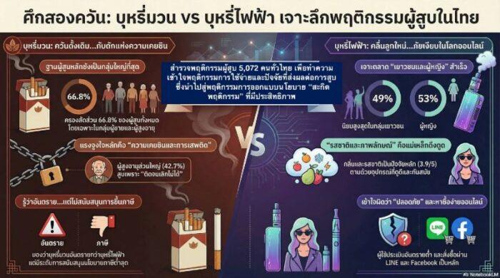 “ข้อมูลเชิงลึกด้านทัศนคติ พบว่า กลุ่มที่มีการศึกษาสูง (ปริญญาตรีขึ้นไป) มีความเข้าใจผิดว่าบุหรี่ไฟฟ้าอันตรายน้อยกว่าบุหรี่มวน โดยผู้สูบที่มีพฤติกรรมสูบทันทีภายใน 5 นาทีหลังตื่นนอน สูงถึง 14.6% สะท้อนการเสพติดนิโคตินระดับรุนแรง โดยคนที่มีเพื่อนสูบบุหรี่มีสูงถึง 86.3% และมีคนในครอบครัวสูบบุหรี่มีเพียง 46.1% ชี้ให้เห็นว่าสังคมเพื่อนมีอิทธิพลมากกว่าคนในบ้าน ส่วนการวิเคราะห์ค่าความยืดหยุ่น พบว่าบุหรี่มวนและบุหรี่ไฟฟ้ามีค่าความยืดหยุ่นใกล้เคียงกัน แม้รายได้จะเปลี่ยนไป แต่พฤติกรรมการสูบกลับไม่ค่อยเปลี่ยนแปลง โดยกลุ่มที่สูบทั้งบุหรี่มวนและบุหรี่ไฟฟ้ามีค่าความยืดหยุ่นสูงถึง 0.47 สะท้อนว่าหากคนกลุ่มนี้มีรายได้มากขึ้น จะใช้เงินไปกับการสูบเพิ่มขึ้นเกือบเท่าตัว” ผศ.ดร.วศิน กล่าว