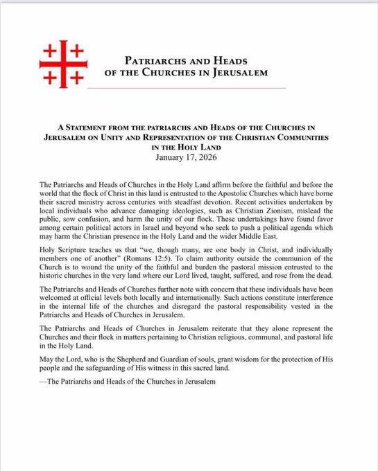 ผู้นำสูงสุดและประมุขคริสตจักรในกรุงเยรูซาเลม ออกแถลงการณ์ร่วมประณามแนวคิด “ไซออนิสม์คริสเตียน” (Christian Zionism) โดยระบุว่าเป็นหนึ่งใน “อุดมการณ์ที่สร้างความเสียหาย” ซึ่งกำลังถูกผลักดันในอิสราเอล และมีส่วนทำให้สาธารณชนเข้าใจผิด สร้างความสับสน และบ่อนทำลายความเป็นเอกภาพของชุมชนคริสต์ในดินแดนศักดิ์สิทธิ์
