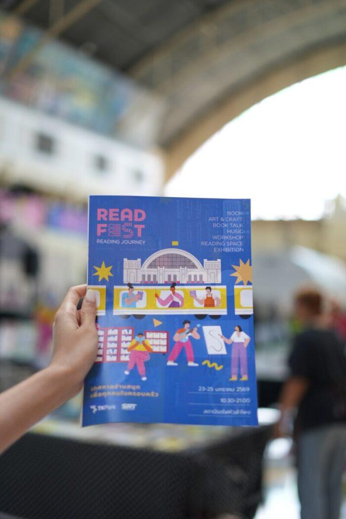 เทศกาล READ FEST: READING JOURNEY จัดขึ้นระหว่างวันที่ 23–25 มกราคม 2569 เวลา 10.30–21.00 น. ณ สถานีรถไฟกรุงเทพ (หัวลำโพง) ติดตามรายละเอียดกิจกรรมเพิ่มเติมได้ที่ Facebook: TK Park อุทยานการเรียนรู้ และ Facebook: Book Festival
