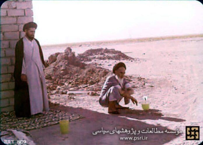 ในภาพ โคมัยนีนั่งทำวุฎูอ์ หรืออาบน้ำละหมาด อยู่ริมทะเลทราย ไม่มีบ้าน ไม่มีรัฐ และไม่มีอำนาจใดคุ้มครอง ด้านหลังคือพรมแดนคูเวตที่ปิดตาย ด้านหน้าคือผืนทรายของอิรักที่ไม่เปิดทาง ข้างกายคือบุตรชายของเขา ซัยยิด อะหมัด โคมัยนี ไม่มีขบวน ไม่มีผู้ติดตาม และไม่มีสัญลักษณ์ของอำนาจใดๆ ปรากฏอยู่ในภาพ