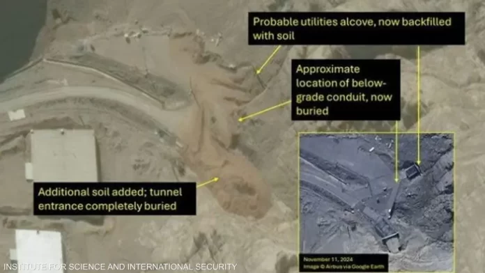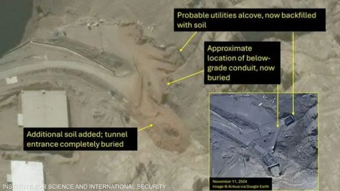 สกายนิวส์อาระเบียรายงานว่า ภาพที่เผยแพร่บนเว็บไซต์ของสถาบันวิทยาศาสตร์และความมั่นคงระหว่างประเทศ (Institute for Science and International Security) ในกรุงวอชิงตัน แสดงให้เห็นปากอุโมงค์หลักทั้งสามแห่งถูกถมด้วยดิน ทำให้ยากต่อการระบุตำแหน่ง โดยสถาบันระบุว่า “ไม่มีการเคลื่อนไหวของยานพาหนะใดๆ ในบริเวณช่องเปิดเหล่านั้น”