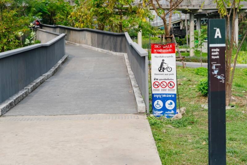 กทม. ให้ความสำคัญอย่างสูงสุดกับการเข้าถึงพื้นที่ โดยโครงการได้ดำเนินการติดตั้งลิฟต์โดยสาร บริเวณจุดเชื่อมต่อสำคัญ และสร้างทางลาด (Ramp) ขนาดใหญ่ความยาวกว่า 57 เมตร ที่มีความลาดชันเหมาะสมตามมาตรฐานสากล เพื่อให้ผู้พิการที่ใช้รถเข็น ผู้สูงอายุ และครอบครัวที่ใช้รถเข็นเด็ก สามารถขึ้นมาใช้พื้นที่พักผ่อนลอยฟ้าได้อย่างเท่าเทียมกันเป็นครั้งแรก