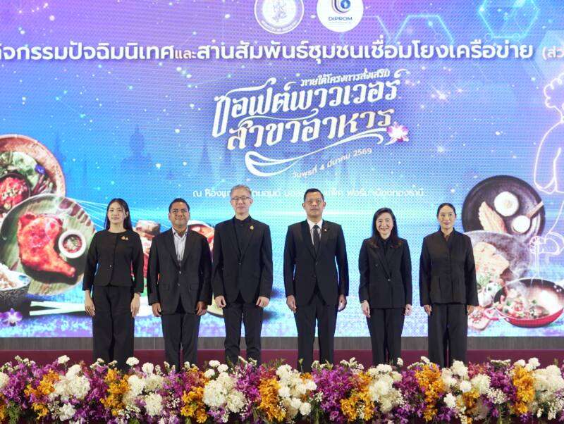 นายธนกร วังบุญคงชนะ รัฐมนตรีว่าการกระทรวงอุตสาหกรรม (ลำดับที่ 4 จากซ้าย) นายณัฐพล รังสิตพล ปลัดกระทรวงอุตสาหกรรม (ลำดับที่ 3 จากซ้าย) พร้อมด้วย นางสาวณัฏฐิญา เนตยสุภา อธิบดีกรมส่งเสริมอุตสาหกรรม (ลำดับที่ 5 จากซ้าย) และคณะผู้บริหาร ร่วมแถลงความสำเร็จ “โครงการส่งเสริมซอฟต์พาวเวอร์สาขาอาหาร ประจำปีงบประมาณ พ.ศ. 2568” ปั้น 20,000 เชฟอาหารไทยทักษะสูง สู่การเป็นกำลังขับเคลื่อนและยกระดับเมนูไทยสู่สินค้าพรีเมียมบนเวทีโลกผ่านหลักสูตร Master Thai Chef Program โดยคาดว่าจะช่วยกระตุ้นเม็ดเงินหมุนเวียนเศรษฐกิจฐานรากกว่า 3,300 ล้านบาท ณ ห้องแกรนด์ไดมอนด์ บอลรูม ศูนย์แสดงสินค้าและการประชุมอิมแพ็ค เมืองทองธานี เมื่อเร็วๆนี้