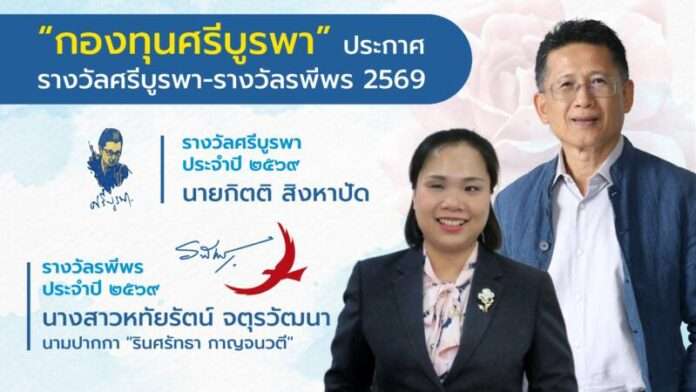 นางชมัยภร บางคมบาง ศิลปินแห่งชาติ สาขาวรรณศิลป์ และประธานกองทุนศรีบูรพา ประกาศผล “รางวัลศรีบูรพา” ประจำปี 2569 ได้แก่ นายกิตติ สิงหาปัด ซึ่งนับว่าได้รับรางวัลเป็นคนที่ 36 ขณะที่ “รางวัลรพีพร” ประจำปี 2569 ได้แก่ นางสาวหทัยรัตน์ จตุรวัฒนา นามปากกา “รินศรัทธา กาญจนวตี”