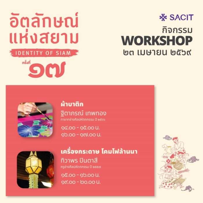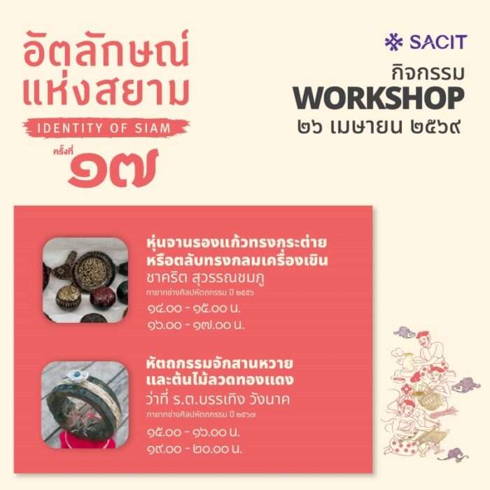 สถาบันส่งเสริมศิลปหัตถกรรมไทย (องค์การมหาชน) จัดงานอัตลักษณ์แห่งสยาม ครั้งที่ 17 (Identity of Siam) วันที่ 22–26 เมษายน 2569 ณ ศูนย์การค้าเอ็มควอเทียร์ “สานภูมิปัญญา สู่ความยั่งยืน” ถ่ายทอดคุณค่างานศิลปหัตถกรรมไทยจากรุ่นสู่รุ่น ผ่านผลงานครูช่างและช่างศิลป์ทั่วประเทศ “From Skill to Masterpiece” โดยจะได้สัมผัสกับกระบวนการ ขั้นตอนการสร้างสรรค์งานหัตถศิลป์ไทยชั้นบรมครูอย่างใกล้ชิด ด้วยการชมกิจกรรมสาธิตงานหัตถกรรมไทยพร้อมร่วมกิจกรรม Workshop และช้อปผลงานสร้างสรรค์ที่ล้ำค่า สร้างความภาคภูมิใจ กว่า 50 ร้านค้า