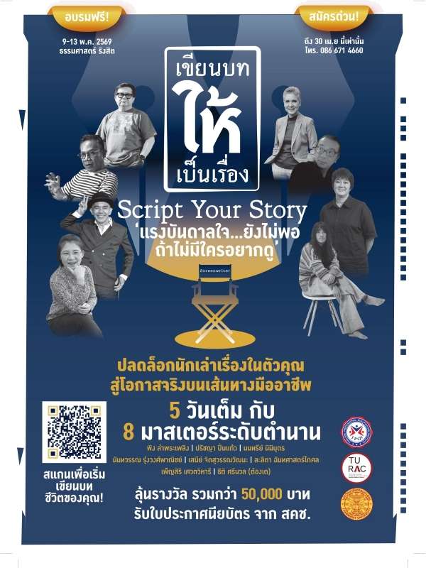 สมาคมผู้กำกับภาพยนตร์ไทย (Thai Film Director Association – TFDA) เปิดโครงการอบรม“เขียนบท ให้ เป็นเรื่อง | Script Your Story” เพื่อสร้างศักยภาพและยกระดับมาตรฐานวิชาชีพนักเขียนบทภาพยนตร์ โดยเปิดคอร์สเรียนรู้ด้านการเขียนบทกับ 8 ผู้กำกับภาพยนตร์และผู้เขียนบทที่ได้รับการยอมรับในวงการหนังไทยว่าเป็น “นักเล่าเรื่องตัวจริง” อาทิ พิง ลำพระเพลิง ปรัชญา ปิ่นแก้ว นนทรีย์ นิมิบุตร นันทวรรณ รุ่งวงศ์พาณิชย์ เสนีย์ จิตสุวรรณวัฒนะ ละลิตา ฉันทศาสตร์โกศล เพ็ญสิริ เศวตวิหารี และ ธิติ ศรีนวล (ต้องเต)