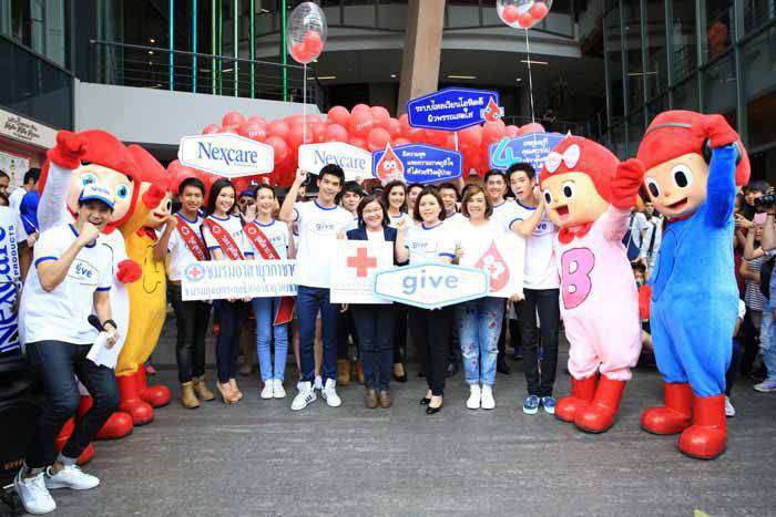 อักษราภัค กวีวาทิต ผู้จัดการฝ่ายการตลาดผลิตภัณฑ์เน็กซ์แคร์ บริษัท 3เอ็ม ประเทศไทย จำกัด (ที่ 2 จากซ้าย) ร่วมกับศูนย์บริการโลหิตแห่งชาติ สภากาชาดไทย จัดกิจกรรมเดินรณรงค์เชิญชวนบริจาคโลหิต ในโครงการ “Give Nexcare™ 2016” ภายใต้ธีม Feel the Beat, Give Blood (เนื่องในวันกาชาดโลก 8 พฤษภาคม) โดยมีหนุ่มฮอตหน้าใสและใจบุญ สกาย – วงศ์รวี นทีธร (ซ้ายสุด) และเจเจ – กฤษณภูมิ พิบูลสงคราม (ขวาสุด) ร่วมงานด้วย ณ บริเวณสยามสแควร์วัน เมื่อวันก่อน