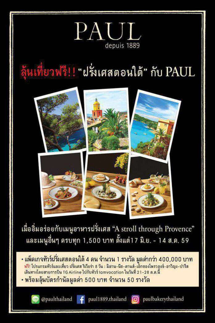 พอล (PAUL) เฟรนช์เบเกอรี่และเรสเตอร์รองระดับโลก ผู้ดำเนินธุรกิจร้านอาหารและเบเกอรี่สไตล์ฝรั่งเศสดั้งเดิม มากว่า 126 ปี ขอพาท่านเปิดประสบการณ์สุดพิเศษ พาบินลัดฟ้าทัวร์ฝรั่งเศสยกทีม พร้อมดื่มด่ำบรรยากาศอันงดงามในดินแดนฝรั่งเศสตอนใต้ เพียงอิ่มอร่อยกับเมนูอาหารฝรั่งเศส เทศกาล ‘A stroll through Provence’ อาหารรสเลิศและวัตถุดิบชั้นดีจากเมือง ‘Marseille’, ‘Saint – Tropez’ ,‘Nice’ ผ่านฝีมือเชฟสุดปราณีต เสิร์ฟเฉพาะที่ ‘PAUL’ เท่านั้น หรือรับประทานเมนูอาหารและเบเกอรี่อื่นๆ ในร้าน ครบทุก 1,500 บาท
