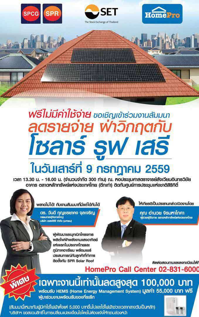 บริษัท โฮม โปรดักส์ เซ็นเตอร์ จำกัด (มหาชน) ร่วมกับบริษัท เอสพีซีจี จำกัด (มหาชน) และตลาดหลักทรัพย์แห่งประเทศไทย ขอเชิญผู้สนใจร่วมงานสัมมนาในหัวข้อ “ลดรายจ่ายฝ่าวิกฤต กับโซลาร์ รูฟ เสรี”เพื่อเตรียมความพร้อมเข้าร่วมโครงการ ในการขายไฟให้ภาครัฐบาล โดยเฉพาะผู้ใช้ไฟตามบ้านในช่วงเวลากลางวัน รับส่วนลดสูงสุด 100,000 บาท พร้อมรับ HEMS(Home Energy Management System)เฉพาะงานนี้เท่านั้น ในวันเสาร์ที่ 9 กรกฏาคม 2559 เวลา 13.30 – 16.00 น. ณ หอประชุมศาสตราจารย์สังเวียนอินทรวิชัย ตลาดหลักทรัพย์แห่งประเทศไทย (ข้างศูนย์การประชุมแห่งชาติสิริกิติ์) รับที่นั่งจำนวนจำกัด ผู้สนใจสำรองที่นั่ง โทร 02-831-6000